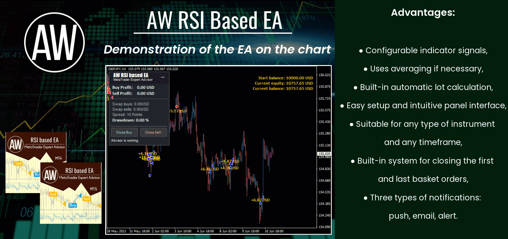 The EA trades on price returns from oversold or overbought conditions, and opens a position when signals are received from the RSI oscillator.