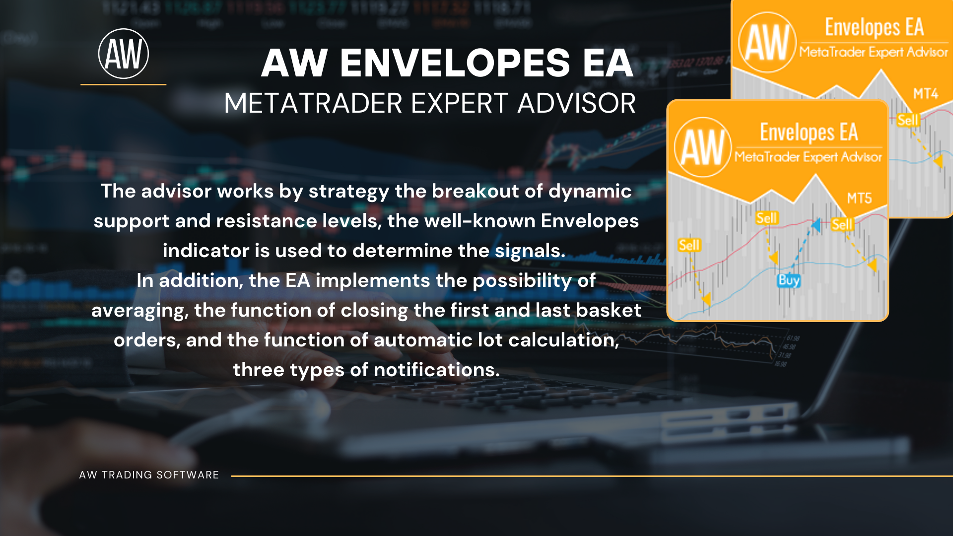 Fully automated trading robot. The advisor works by strategy the breakout of dynamic support and resistance levels, the well-known Envelopes indicator is used to determine the signals. In addition, the EA implements the possibility of averaging, the function of closing the first and last basket orders and the function of automatic lot calculation, three types of notifications.