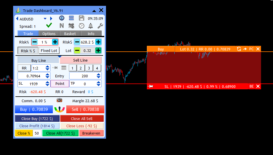 The red border around Risk%, Risk$, or Lot Size shows which value is currently used as the base for lot-size and risk calculation in Trade Dashboard.
