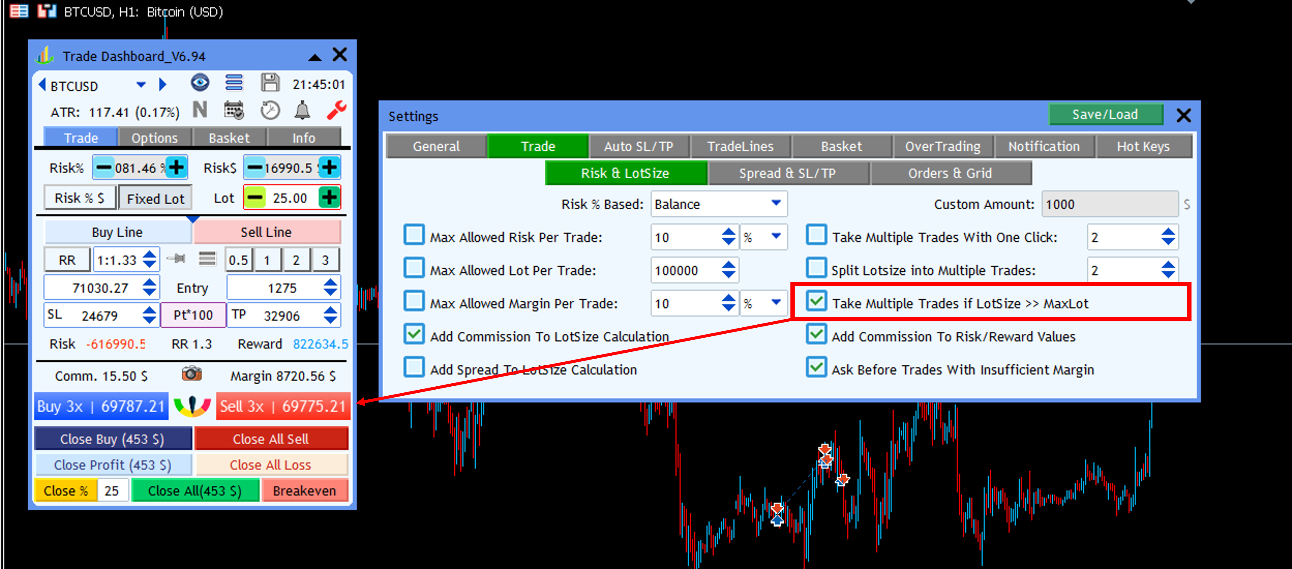 ✔️ Enable **"Take Multiple Trades if Lotsize >> MaxLot"**