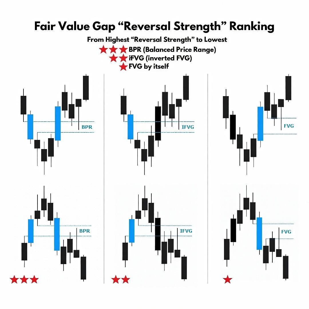 什么是平衡价格区间(BPR)? 平衡价格区间(Balanced Price Range,BPR)是一种市场均衡区域,由两个相反方向的公允价值缺口(Fair Value Gaps)重叠形成。 图表解析(如图所示): 红色K线: 形成看跌动能(卖方)。 绿色K线: 形成看涨动能(买方)。 灰色矩形: 这就是BPR。价格通过反向运动"锁定"前一段走势无效性的区域。 核心规则: BPR不仅仅是K线的聚集,而是两个不同公允价值缺口价格区间的实际交叉重叠。 为什么有效? 该区域集中了两个方向的流动性。对于智能钱算法而言,这个区域是建立头寸或平仓亏损订单的感兴趣区域...