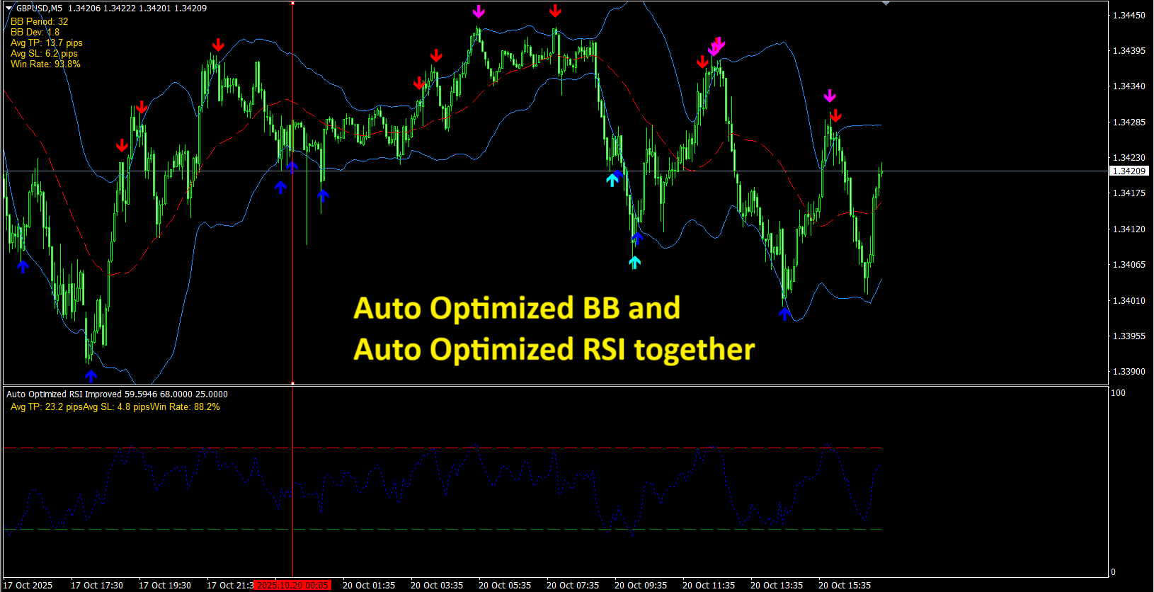 Auto Optimized Bollinger Bands and Auto Optimized RSI working in Combination :) This way our 88% and 93% accuracy of each indicator signals get even better with each other confirmation: https://www.mql5.com/en/market/product/145488
