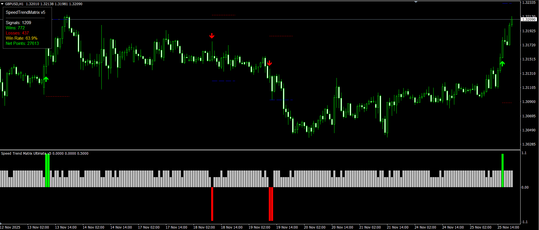 Speed Trend Matrix Ultimate (Versão 5.10) O Speed Trend Matrix (STM) é um sistema de negociação abrangente encapsulado em um único indicador. Ao contrário dos osciladores padrão que simplesmente mostram condições de sobrecompra ou sobrevenda, o STM analisa a "velocidade" do movimento do preço em relação à volatilidade do mercado (ATR). Ele não apenas identifica a direção da tendência, mas também a força por trás do movimento, filtrando períodos "planos" de baixa inércia onde os traders são