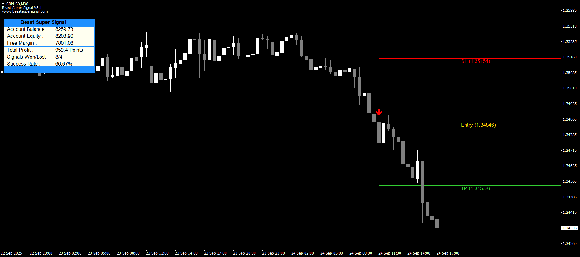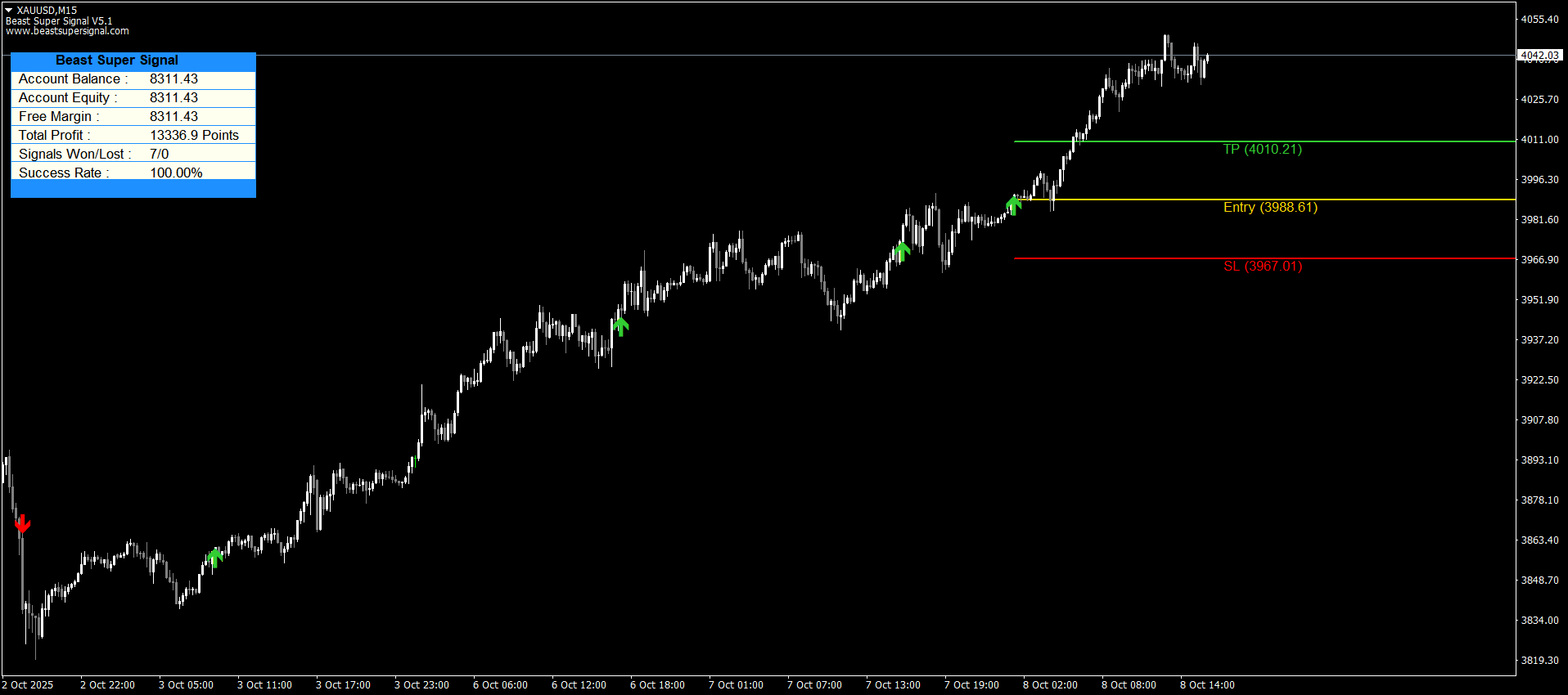The Beast Super Signal indicator is primarily for those who prefer to trade manually. The indicator will give you buy and sell signal alerts with visible buy and sell arrows on the chart telling you when to buy and when to sell, and then you open the orders manually. Each signal comes with an entry price and suggested stop-loss and take-profit prices on the chart. The signals do not recalculate or repaint. Once a signal appears on the chart it will not move or disappear, 100% guaranteed.