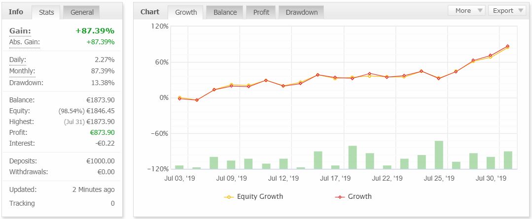 First month signal AMSTERDAM: 87.39% with 13.38% DD.