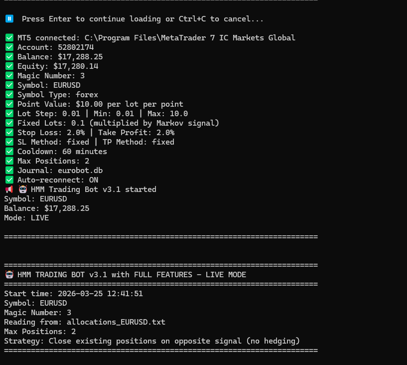 This is an automated trading bot that connects your HMM Markov model to a real MT5 trading account.