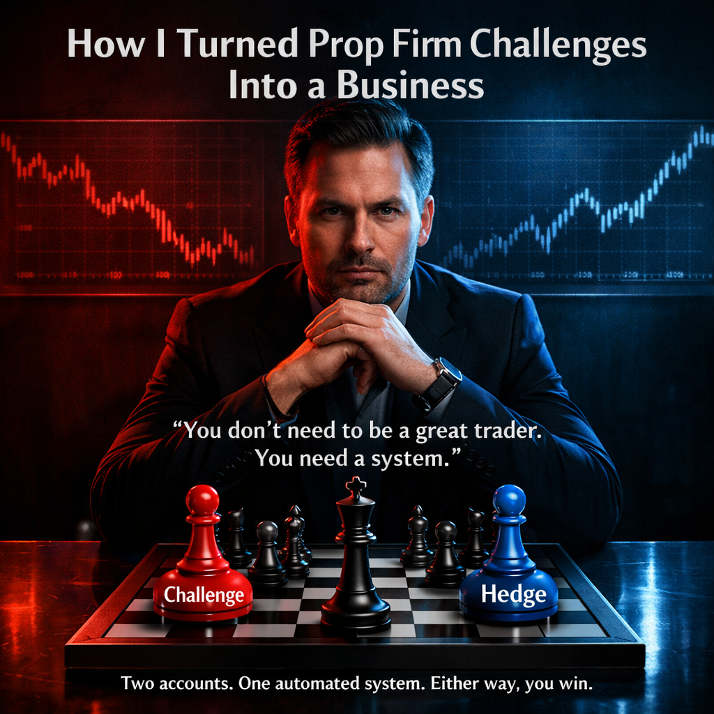 Mine runs two accounts simultaneously — one takes the challenge, the other hedges on a personal live account. Challenge fails? The hedge profits. Challenge passes? You keep the funded account.