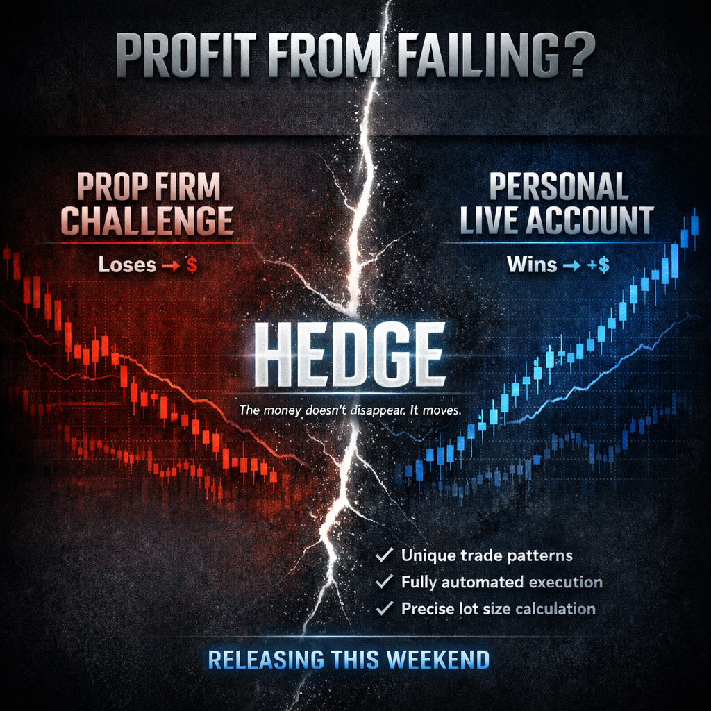 **Prop Firm Hedge Live** — runs on your personal live account. Automatically mirrors the opposite side of every trade. If your challenge blows up, your live account profits.