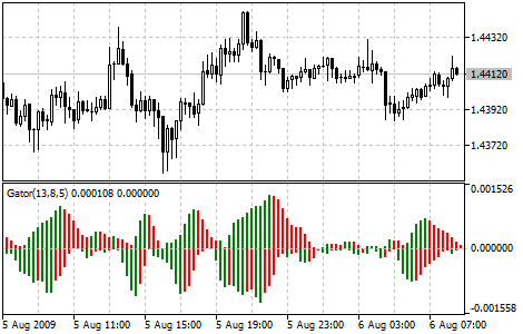 Gator Oscillator строится на основе Alligator и показывает степень схождения/расхождения его линий баланса (сглаженное скользящее среднее). Верхняя гистограмма — абсолютная разница между значениями синей линии и красной линии. Нижняя гистограмма — абсолютная разница между значениями красной линии и зеленой линии, но со знаком минус, потому что гистограмма рисуется сверху вниз.