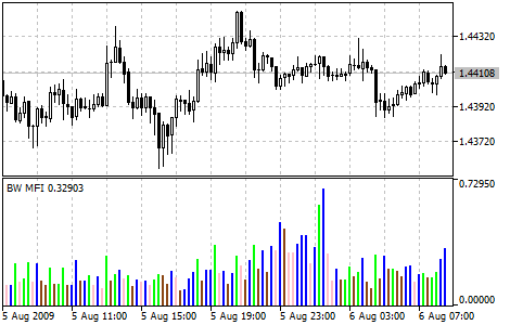 Технический индикатор Индекс Облегчения Рынка (Market Facilitation Index, BW MFI) показывает изменение цены, приходящееся на один тик. Абсолютные величины индикатора сами по себе ничего не значат, смысл имеют лишь изменения индикатора. Билл Вильямс придает большое значение изменениям индикатора и объема: