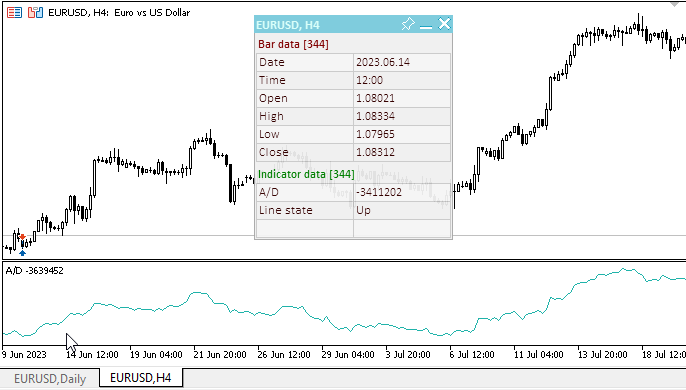 //+------------------------------------------------------------------+ //| TestVolumeAD.mq5 | //| Copyright 2023, MetaQuotes Ltd. | //| https://www.mql5.com | //+------------------------------------------------------------------+ #property copyright "Copyright 2023, MetaQuotes Ltd." #property link "https://www.mql5.com" #property version "1.00" //--- includes #include <Dashboard\Dashboard.mqh> //--- enums enum ENUM_LINE_STATE { LINE_STATE_NONE, // Неопределённое состояние LINE_STATE_UP, // Направление вверх LINE_STATE_DOWN, // Направление вниз LINE_STATE_TURN_UP, // Разворот вверх LINE_STATE_TURN_DOWN, // Разворот вниз LINE_STATE_STOP_UP, // Остановка направления вверх LINE_STATE_STOP_DOWN, // Остановка направления вниз LINE_STATE_ABOVE, // Над значением LINE_STATE_UNDER, // Под значением LINE_STATE_CROSS_UP, // Пересечение значения вверх LINE_STATE_CROSS_DOWN, // Пересечение значения вниз LINE_STATE_TOUCH_BELOW, // Касание значения снизу LINE_STATE_TOUCH_ABOVE, // Касание значения сверху LINE_STATE_EQUALS, // Равно значению }; //--- input parameters input ENUM_APPLIED_VOLUME InpVolume = VOLUME_TICK; /* Applied Volume */ // Применяемый объём для расчёта A/D //--- global variables int handle=INVALID_HANDLE; // Хэндл индикатора int ind_digits=0; // Количество знаков после запятой в значении индикатора string ind_title; // Описание индикатора //--- переменные для панели int mouse_bar_index; // Индекс бара, с которого берутся данные CDashboard *panel=NULL; // Указатель на объект панели