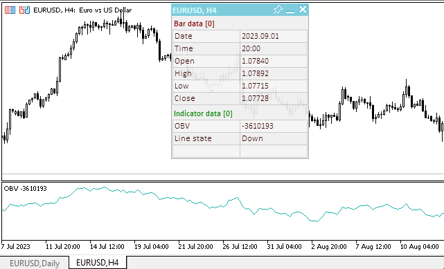//+------------------------------------------------------------------+ //| TestVolumeOBV.mq5 | //| Copyright 2023, MetaQuotes Ltd. | //| https://www.mql5.com | //+------------------------------------------------------------------+ #property copyright "Copyright 2023, MetaQuotes Ltd." #property link "https://www.mql5.com" #property version "1.00" //--- includes #include <Dashboard\Dashboard.mqh> //--- enums enum ENUM_LINE_STATE { LINE_STATE_NONE, // Неопределённое состояние LINE_STATE_UP, // Направление вверх LINE_STATE_DOWN, // Направление вниз LINE_STATE_TURN_UP, // Разворот вверх LINE_STATE_TURN_DOWN, // Разворот вниз LINE_STATE_STOP_UP, // Остановка направления вверх LINE_STATE_STOP_DOWN, // Остановка направления вниз LINE_STATE_ABOVE, // Над значением LINE_STATE_UNDER, // Под значением LINE_STATE_CROSS_UP, // Пересечение значения вверх LINE_STATE_CROSS_DOWN, // Пересечение значения вниз LINE_STATE_TOUCH_BELOW, // Касание значения снизу LINE_STATE_TOUCH_ABOVE, // Касание значения сверху LINE_STATE_EQUALS, // Равно значению }; //--- input parameters input ENUM_APPLIED_VOLUME InpVolume = VOLUME_TICK; /* Applied Volume */ // Применяемый объём для расчёта OBV //--- global variables int handle=INVALID_HANDLE; // Хэндл индикатора int ind_digits=0; // Количество знаков после запятой в значении индикатора string ind_title; // Описание индикатора //--- переменные для панели int mouse_bar_index; // Индекс бара, с которого берутся данные CDashboard *panel=NULL; // Указатель на объект панели