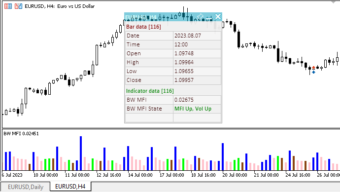 Здесь стоит отметить, что получение данных индикатора BW MFI возможно обычным способом — посредством предоставленных здесь универсальных функций. Но для интерпретации показаний столбцов индикатора нужен ещё один индикатор — индикатор объёмов (Volumes), так как для расцветки столбцов гистограммы сравниваются два показателя — значение столбца гистограммы и значение объёма относительно их предыдущих значений. Для получения объёма в функции создаётся хэндл индикатора Volumes (единожды при первом обращении), и далее сравниваются состояния линий индикатора BW MFI и Volumes. Описание их взаимного соотношения выводятся на панель в виде текста.