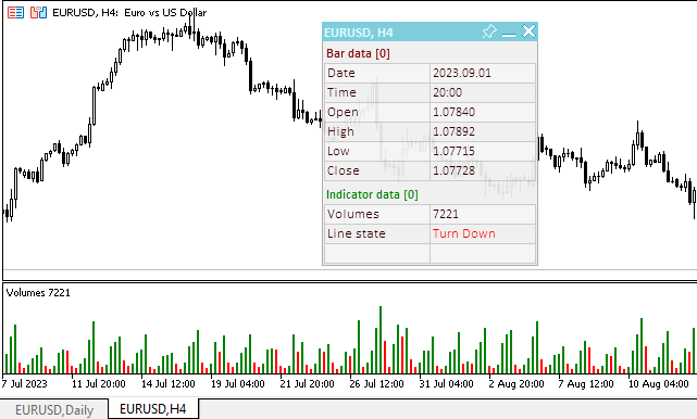 //+------------------------------------------------------------------+ //| TestVolumeAD.mq5 | //| Copyright 2023, MetaQuotes Ltd. | //| https://www.mql5.com | //+------------------------------------------------------------------+ #property copyright "Copyright 2023, MetaQuotes Ltd." #property link "https://www.mql5.com" #property version "1.00" //--- enums enum ENUM_LINE_STATE { LINE_STATE_NONE, // Неопределённое состояние LINE_STATE_UP, // Направление вверх LINE_STATE_DOWN, // Направление вниз LINE_STATE_TURN_UP, // Разворот вверх LINE_STATE_TURN_DOWN, // Разворот вниз LINE_STATE_STOP_UP, // Остановка направления вверх LINE_STATE_STOP_DOWN, // Остановка направления вниз LINE_STATE_ABOVE, // Над значением LINE_STATE_UNDER, // Под значением LINE_STATE_CROSS_UP, // Пересечение значения вверх LINE_STATE_CROSS_DOWN, // Пересечение значения вниз LINE_STATE_TOUCH_BELOW, // Касание значения снизу LINE_STATE_TOUCH_ABOVE, // Касание значения сверху LINE_STATE_EQUALS, // Равно значению }; //--- input parameters input ENUM_APPLIED_VOLUME InpVolume = VOLUME_TICK; /* Applied Volume */ // Применяемый объём для расчёта A/D //--- global variables int handle=INVALID_HANDLE; // Хэндл индикатора int ind_digits=0; // Количество знаков после запятой в значении индикатора string ind_title; // Описание индикатора