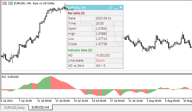 После компиляции и запуска советника на графике мы можем контролировать значение и состояние линии индикатора на информационной панели: