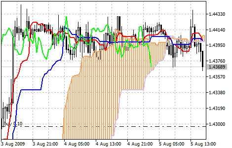 Цвет значений линий Tenkan-sen и Kijun-sen зависит от их взаимного расположения и направления.