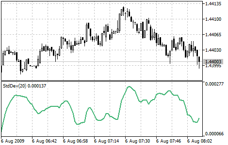 Технический индикатор Стандартное отклонение (Standard Deviation, StdDev) измеряет волатильность рынка. Этот индикатор характеризует размер колебаний цены относительно скользящего среднего. Так, если значение индикатора велико, то рынок является волатильным и цены баров достаточно разбросаны относительно скользящего среднего. Если значение индикатора невелико, рынок характеризуется низкой волатильностью и цены баров достаточно близки к скользящему среднему.