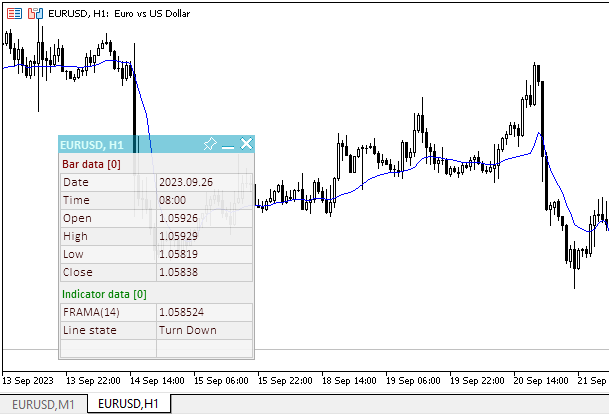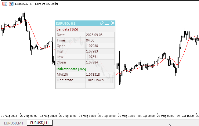 После компиляции и запуска советника на графике мы можем контролировать значение и состояние линии индикатора на информационной панели: