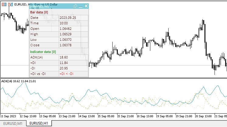 //+------------------------------------------------------------------+ //| Выводит данные с указанного индекса таймсерии на панель | //+------------------------------------------------------------------+ void DrawData(const int index,const datetime time) { //--- Объявляем переменные для получения в них данных MqlTick tick={0}; MqlRates rates[1]; //--- Если текущие цены получить не удалось - уходим if(!SymbolInfoTick(Symbol(),tick)) return; //--- Если данные бара по указанному индексу получить не удалось - уходим if(CopyRates(Symbol(),PERIOD_CURRENT,index,1,rates)!=1) return; //--- Устанавливаем параметры шрифта для заголовков данных бара и индикатора int size=0; uint flags=0; uint angle=0; string name=panel.FontParams(size,flags,angle); panel.SetFontParams(name,9,FW_BOLD); panel.DrawText("Bar data ["+(string)index+"]",3,panel.TableY1(0)-16,clrMaroon,panel.Width()-6); panel.DrawText("Indicator data ["+(string)index+"]",3,panel.TableY1(1)-16,clrGreen,panel.Width()-6); //--- Устанавливаем параметры шрифта для данных бара и индикатора panel.SetFontParams(name,9); //--- Выводим на панель данные указанного бара в таблицу 0 panel.DrawText("Date", panel.CellX(0,0,0)+2, panel.CellY(0,0,0)+2); panel.DrawText(TimeToString( rates[0].time,TIME_DATE), panel.CellX(0,0,1)+2, panel.CellY(0,0,1)+2,clrNONE,90); panel.DrawText("Time", panel.CellX(0,1,0)+2, panel.CellY(0,1,0)+2); panel.DrawText(TimeToString( rates[0].time,TIME_MINUTES), panel.CellX(0,1,1)+2, panel.CellY(0,1,1)+2,clrNONE,90); panel.DrawText("Open", panel.CellX(0,2,0)+2, panel.CellY(0,2,0)+2); panel.DrawText(DoubleToString(rates[0].open,Digits()), panel.CellX(0,2,1)+2, panel.CellY(0,2,1)+2,clrNONE,90); panel.DrawText("High", panel.CellX(0,3,0)+2, panel.CellY(0,3,0)+2); panel.DrawText(DoubleToString(rates[0].high,Digits()), panel.CellX(0,3,1)+2, panel.CellY(0,3,1)+2,clrNONE,90); panel.DrawText("Low", panel.CellX(0,4,0)+2, panel.CellY(0,4,0)+2); panel.DrawText(DoubleToString(rates[0].low,Digits()), panel.CellX(0,4,1)+2, panel.CellY(0,4,1)+2,clrNONE,90); panel.DrawText("Close", panel.CellX(0,5,0)+2, panel.CellY(0,5,0)+2); panel.DrawText(DoubleToString(rates[0].close,Digits()), panel.CellX(0,5,1)+2, panel.CellY(0,5,1)+2,clrNONE,90); //--- Выводим на панель данные линии ADX с указанного бара в таблицу 1 panel.DrawText(ind_title, panel.CellX(1,0,0)+2, panel.CellY(1,0,0)+2); double value=IndicatorValue(handle,index,MAIN_LINE); string value_str=(value!=EMPTY_VALUE ? DoubleToString(value,ind_digits) : ""); panel.DrawText(value_str,panel.CellX(1,0,1)+2,panel.CellY(1,0,1)+2,clrNONE,100); //--- Выводим на панель данные линии +DI с указанного бара в таблицу 1 panel.DrawText("+DI", panel.CellX(1,1,0)+2, panel.CellY(1,1,0)+2); double value_dip=IndicatorValue(handle,index,PLUSDI_LINE); string value_dip_str=(value_dip!=EMPTY_VALUE ? DoubleToString(value_dip,ind_digits) : ""); panel.DrawText(value_dip_str,panel.CellX(1,1,1)+2,panel.CellY(1,1,1)+2,clrNONE,100); //--- Выводим на панель данные линии -DI с указанного бара в таблицу 1 panel.DrawText("-DI", panel.CellX(1,2,0)+2, panel.CellY(1,2,0)+2); double value_dim=IndicatorValue(handle,index,MINUSDI_LINE); string value_dim_str=(value_dim!=EMPTY_VALUE ? DoubleToString(value_dim,ind_digits) : ""); panel.DrawText(value_dim_str,panel.CellX(1,2,1)+2,panel.CellY(1,2,1)+2,clrNONE,100); //--- Выводим описание соотношения линии +DI и -DI panel.DrawText("+DI vs -DI", panel.CellX(1,3,0)+2, panel.CellY(1,3,0)+2); ENUM_LINE_STATE state=LineStateRelative(handle,index,1,value_dim,IndicatorValue(handle,index+1,2)); string state_di_str=LineStateDescription(state); color clr=clrNONE; if(state==LINE_STATE_ABOVE) { state_di_str="+DI > -DI"; clr=clrGreen; } if(state==LINE_STATE_CROSS_UP) clr=clrGreen; if(state==LINE_STATE_UNDER) { state_di_str="+DI < -DI"; clr=clrRed; } if(state==LINE_STATE_CROSS_DOWN) clr=clrRed; panel.DrawText(state_di_str,panel.CellX(1,3,1)+2,panel.CellY(1,3,1)+2,clr,90); //--- Перерисовываем график для немедленного отображения всех изменений на панели ChartRedraw(ChartID()); }