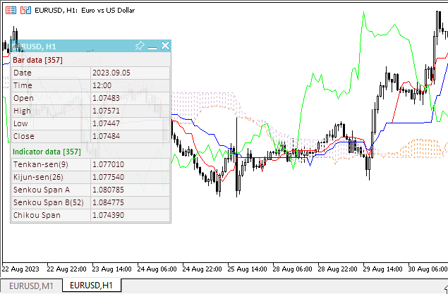 //+------------------------------------------------------------------+ //| Выводит данные с указанного индекса таймсерии на панель | //+------------------------------------------------------------------+ void DrawData(const int index,const datetime time) { //--- Объявляем переменные для получения в них данных MqlTick tick={0}; MqlRates rates[1]; //--- Если текущие цены получить не удалось - уходим if(!SymbolInfoTick(Symbol(),tick)) return; //--- Если данные бара по указанному индексу получить не удалось - уходим if(CopyRates(Symbol(),PERIOD_CURRENT,index,1,rates)!=1) return; //--- Устанавливаем параметры шрифта для заголовков данных бара и индикатора int size=0; uint flags=0; uint angle=0; string name=panel.FontParams(size,flags,angle); panel.SetFontParams(name,9,FW_BOLD); panel.DrawText("Bar data ["+(string)index+"]",3,panel.TableY1(0)-16,clrMaroon,panel.Width()-6); panel.DrawText("Indicator data ["+(string)index+"]",3,panel.TableY1(1)-16,clrGreen,panel.Width()-6); //--- Устанавливаем параметры шрифта для данных бара и индикатора panel.SetFontParams(name,9); //--- Выводим на панель данные указанного бара в таблицу 0 panel.DrawText("Date", panel.CellX(0,0,0)+2, panel.CellY(0,0,0)+2); panel.DrawText(TimeToString( rates[0].time,TIME_DATE), panel.CellX(0,0,1)+2, panel.CellY(0,0,1)+2,clrNONE,90); panel.DrawText("Time", panel.CellX(0,1,0)+2, panel.CellY(0,1,0)+2); panel.DrawText(TimeToString( rates[0].time,TIME_MINUTES), panel.CellX(0,1,1)+2, panel.CellY(0,1,1)+2,clrNONE,90); panel.DrawText("Open", panel.CellX(0,2,0)+2, panel.CellY(0,2,0)+2); panel.DrawText(DoubleToString(rates[0].open,Digits()), panel.CellX(0,2,1)+2, panel.CellY(0,2,1)+2,clrNONE,90); panel.DrawText("High", panel.CellX(0,3,0)+2, panel.CellY(0,3,0)+2); panel.DrawText(DoubleToString(rates[0].high,Digits()), panel.CellX(0,3,1)+2, panel.CellY(0,3,1)+2,clrNONE,90); panel.DrawText("Low", panel.CellX(0,4,0)+2, panel.CellY(0,4,0)+2); panel.DrawText(DoubleToString(rates[0].low,Digits()), panel.CellX(0,4,1)+2, panel.CellY(0,4,1)+2,clrNONE,90); panel.DrawText("Close", panel.CellX(0,5,0)+2, panel.CellY(0,5,0)+2); panel.DrawText(DoubleToString(rates[0].close,Digits()), panel.CellX(0,5,1)+2, panel.CellY(0,5,1)+2,clrNONE,90); //--- Получаем данные буферов индикатора double tenkan=IndicatorValue(handle,index,TENKANSEN_LINE); // Линия Tenkan Sen double kijun =IndicatorValue(handle,index,KIJUNSEN_LINE); // Линия Kijun Sen double spana =IndicatorValue(handle,index,SENKOUSPANA_LINE); // Линия Senkou Span A double spanb =IndicatorValue(handle,index,SENKOUSPANB_LINE); // Линия Senkou Span B double chikou=IndicatorValue(handle,index,CHIKOUSPAN_LINE); // Линия Chikou Span color clr=clrNONE; //--- Выводим на панель данные линии Tenkan Sen с указанного бара в таблицу 1 string tenkan_str=StringFormat("Tenkan-sen(%lu)",period_tenkan); panel.DrawText(tenkan_str, panel.CellX(1,0,0)+2, panel.CellY(1,0,0)+2); string value_str=(tenkan!=EMPTY_VALUE ? DoubleToString(tenkan,ind_digits) : " "); ENUM_LINE_STATE state_tenkan=LineStateRelative(handle,index,TENKANSEN_LINE,kijun,IndicatorValue(handle,index+1,KIJUNSEN_LINE)); clr=(state_tenkan==LINE_STATE_CROSS_UP ? clrBlue : state_tenkan==LINE_STATE_CROSS_DOWN ? clrRed : clrNONE); panel.DrawText(value_str,panel.CellX(1,0,1)+2,panel.CellY(1,0,1)+2,clr,100); //--- Выводим на панель данные линии Kijun Sen с указанного бара в таблицу 1 string kijun_str=StringFormat("Kijun-sen(%lu)",period_kijun); panel.DrawText(kijun_str, panel.CellX(1,1,0)+2, panel.CellY(1,1,0)+2); value_str=(kijun!=EMPTY_VALUE ? DoubleToString(kijun,ind_digits) : " "); ENUM_LINE_STATE state_kijun=LineState(handle,index,KIJUNSEN_LINE); clr= ( state_kijun==LINE_STATE_UP || state_kijun==LINE_STATE_TURN_UP ? clrBlue : state_kijun==LINE_STATE_DOWN || state_kijun==LINE_STATE_TURN_DOWN ? clrRed : clrNONE ); panel.DrawText(value_str,panel.CellX(1,1,1)+2,panel.CellY(1,1,1)+2,clr,100); //--- Выводим на панель данные линии Senkou Span A с указанного бара в таблицу 1 panel.DrawText("Senkou Span A", panel.CellX(1,2,0)+2, panel.CellY(1,2,0)+2); value_str=(spana!=EMPTY_VALUE ? DoubleToString(spana,ind_digits) : " "); panel.DrawText(value_str,panel.CellX(1,2,1)+2,panel.CellY(1,2,1)+2,clrNONE,100); //--- Выводим на панель данные линии Senkou Span B с указанного бара в таблицу 1 string spanb_str=StringFormat("Senkou Span B(%lu)",period_spanb); panel.DrawText(spanb_str, panel.CellX(1,3,0)+2, panel.CellY(1,3,0)+2); value_str=(spanb!=EMPTY_VALUE ? DoubleToString(spanb,ind_digits) : " "); panel.DrawText(value_str,panel.CellX(1,3,1)+2,panel.CellY(1,3,1)+2,clrNONE,100); //--- Выводим на панель данные линии Chikou Span с указанного бара в таблицу 1 panel.DrawText("Chikou Span", panel.CellX(1,4,0)+2, panel.CellY(1,4,0)+2); value_str=(chikou!=EMPTY_VALUE ? DoubleToString(chikou,ind_digits) : " "); panel.DrawText(value_str,panel.CellX(1,4,1)+2,panel.CellY(1,4,1)+2,clrNONE,100); //--- Перерисовываем график для немедленного отображения всех изменений на панели ChartRedraw(ChartID()); }