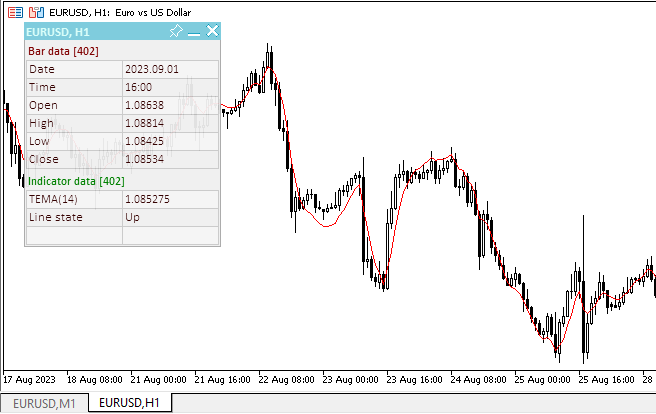 //+------------------------------------------------------------------+ //| TestTrendTEMA.mq5 | //| Copyright 2023, MetaQuotes Ltd. | //| https://www.mql5.com | //+------------------------------------------------------------------+ #property copyright "Copyright 2023, MetaQuotes Ltd." #property link "https://www.mql5.com" #property version "1.00" //--- includes #include <Dashboard\Dashboard.mqh> //--- enums enum ENUM_LINE_STATE { LINE_STATE_NONE, // Неопределённое состояние LINE_STATE_UP, // Направление вверх LINE_STATE_DOWN, // Направление вниз LINE_STATE_TURN_UP, // Разворот вверх LINE_STATE_TURN_DOWN, // Разворот вниз LINE_STATE_STOP_UP, // Остановка направления вверх LINE_STATE_STOP_DOWN, // Остановка направления вниз LINE_STATE_ABOVE, // Над значением LINE_STATE_UNDER, // Под значением LINE_STATE_CROSS_UP, // Пересечение значения вверх LINE_STATE_CROSS_DOWN, // Пересечение значения вниз LINE_STATE_TOUCH_BELOW, // Касание значения снизу LINE_STATE_TOUCH_ABOVE, // Касание значения сверху LINE_STATE_EQUALS, // Равно значению }; //--- input parameters input uint InpPeriod= 14; /* Period */ // Период расчёта Triple Exponential Moving Average input int InpShift = 0; /* StdDev Shift */ // Сдвиг линии индикатора input ENUM_APPLIED_PRICE InpPrice = PRICE_CLOSE; /* Applied Price */ // Цена расчёта Triple Exponential Moving Average //--- global variables int handle=INVALID_HANDLE; // Хэндл индикатора int period=0; // Период расчёта Triple Exponential Moving Average int ind_digits=0; // Количество знаков после запятой в значении индикатора string ind_title; // Описание индикатора //--- переменные для панели int mouse_bar_index; // Индекс бара, с которого берутся данные CDashboard *panel=NULL; // Указатель на объект панели