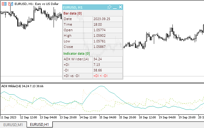Помимо данных линий индикатора на панель выводится описание соотношения линий +DI и -DI, по сути являющимися сигнальными линиями индикатора.