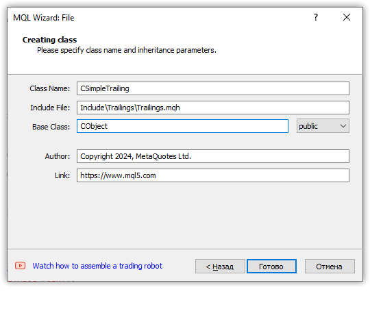 Имя класса должно быть CSimpleTrailing, имя создаваемого файла Trailings.mqh, а базовым классом должен быть класс базового объекта Стандартной Библиотеки CObject:
