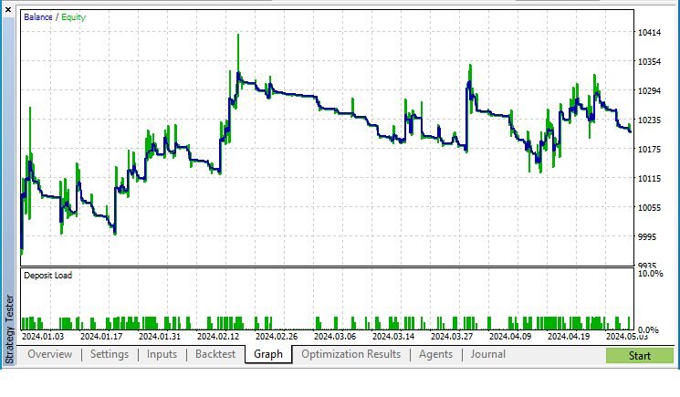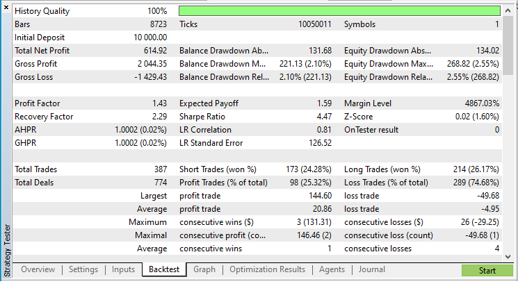 Скомпилируем советник и запустим в тестере с параметрами по умолчанию: