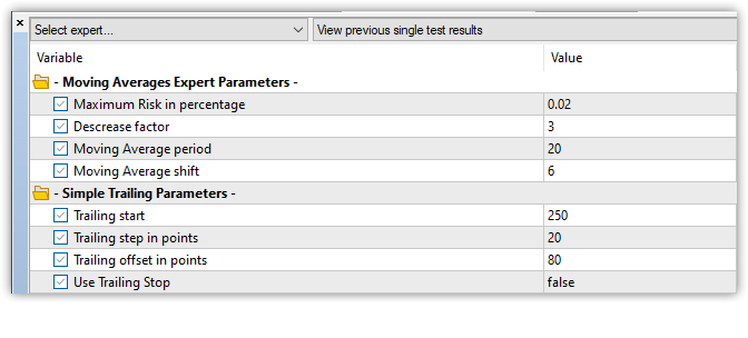 Класс абсолютно идентичен выше рассмотренному классу трала по Parabolic SAR. В каждом классе тралов по скользящим средним будет собственный набор переменных для хранения параметров индикатора и соответствующие этим переменным методы установки и возврата значений. Все классы тралов по скользящим средним идентичны друг другу, и изучить их можно, посмотрев коды в прикреплённом к статье файлу классов трейлингов Trailings.mqh. Протестировать работу класса трейлинга по простой скользящей средней можно, запустив тестовый советник из файла ExpertMACDWithTrailingByMA.mq5, также прикреплённый в конце статьи.