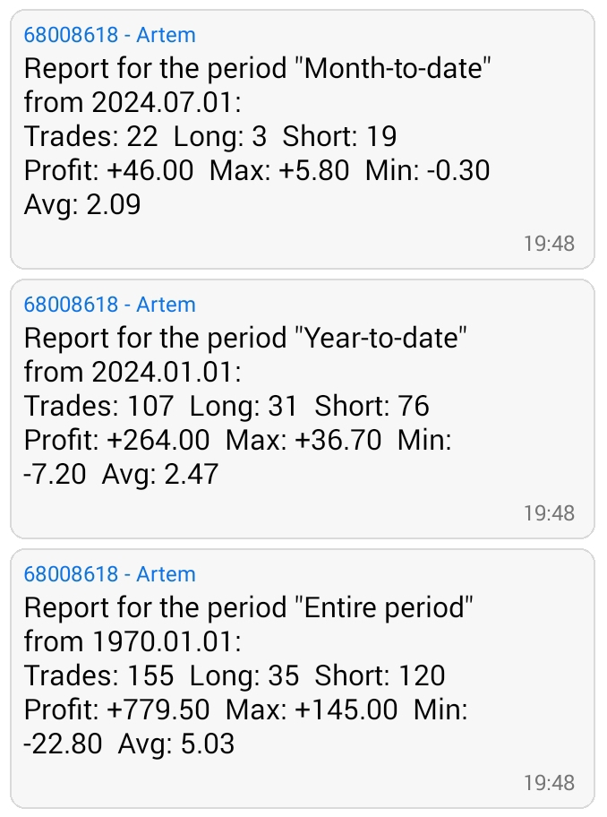 Reporter -Service notifications OK Reporter 68008618: Artem (MetaQuotes Ltd., Demo, 10779.50 USD, Hedging) Reporter Beginning to create a list of closed positions... Reporter A list of 155 positions was created in 8515 ms Reporter "Daily" no trades Reporter "Weekly" no trades Reporter Report for the period "Month-to-date" from 2024.07.01 00:00 Reporter | Symbols | Trades | Long | Short | Profit | Max | Min | Avg | Costs | Reporter | 2 | 22 | 3 | 19 | +46.00 | +5.80 | -0.30 | 2.09 | 0.00 | Reporter Reporter Report for the period "Year-to-date" from 2024.01.01 00:00 Reporter | Symbols | Trades | Long | Short | Profit | Max | Min | Avg | Costs | Reporter | 2 | 107 | 31 | 76 | +264.00 | +36.70 | -7.20 | 2.47 | 0.00 | Reporter Reporter Report for the period "Entire period" from 1970.01.01 00:00 Reporter | Symbols | Trades | Long | Short | Profit | Max | Min | Avg | Costs | Reporter | 2 | 155 | 35 | 120 | +779.50 | +145.00 | -22.80 | 5.03 | 0.00 | Reporter Reporter Beginning of sending 3 notifications to MQID Reporter Sending 3 notifications completed