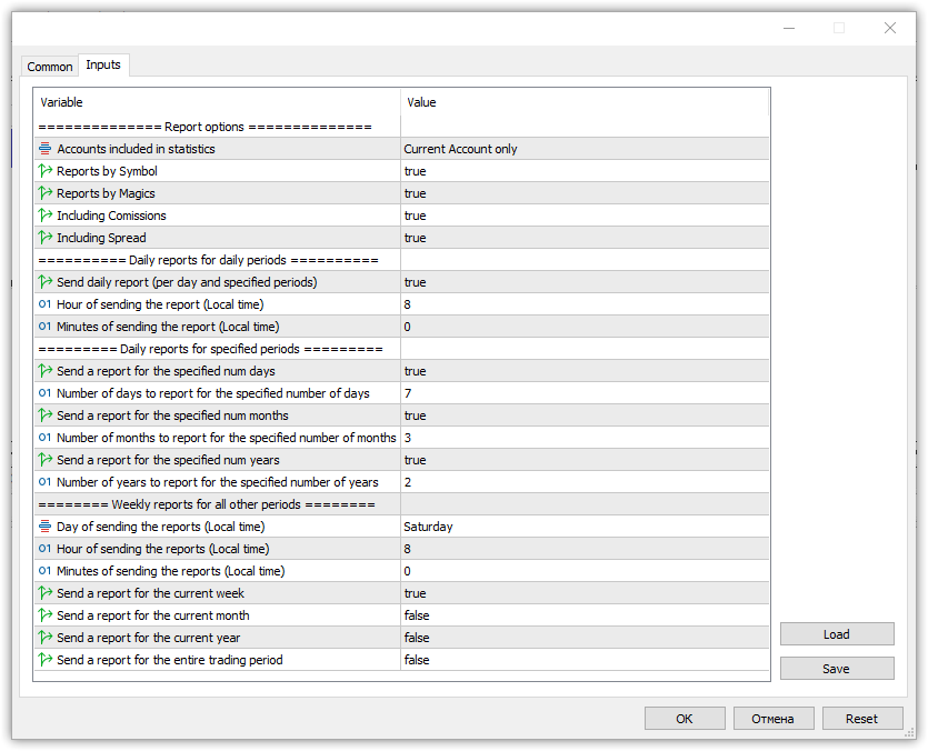 Если же в настройках отключить отчёты в разрезе символов и магиков, отключить комиссии и спреды, запретить отчёты за заданное количество дней, но разрешить дневные, за текущую неделю, месяц и год,