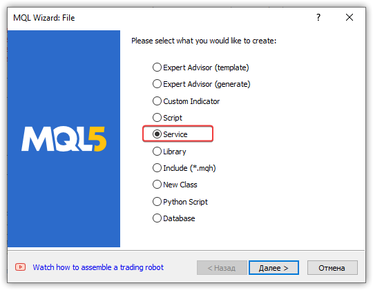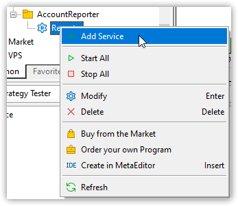 Наша программа должна запускаться в момент запуска терминала, отслеживать смену аккаунта или торгового счёта, наступление дня и времени для создания и отправки отчётов. Для таких целей нам подойдёт тип программы "Сервис".