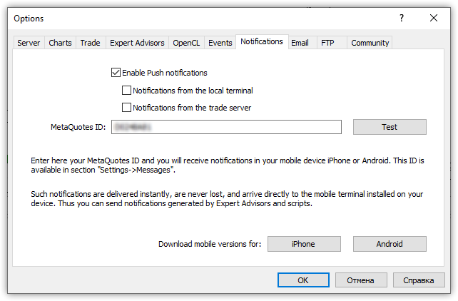 //+------------------------------------------------------------------+ //| Проверка настроек уведомлений | //+------------------------------------------------------------------+ //--- Если флаг уведомлений не установлен - проверяем настройки уведомлений в терминале и, если активированы - сообщаем об этом if(!ExtNotify && TerminalInfoInteger(TERMINAL_MQID) && TerminalInfoInteger(TERMINAL_NOTIFICATIONS_ENABLED)) { Print("Now MetaQuotes ID is specified and sending notifications is allowed"); SendNotification("Now MetaQuotes ID is specified and sending notifications is allowed"); ExtNotify=true; } //--- Если флаг уведомлений установлен, но в терминале нет на них разрешения - сообщаем об этом if(ExtNotify && (!TerminalInfoInteger(TERMINAL_MQID) || !TerminalInfoInteger(TERMINAL_NOTIFICATIONS_ENABLED))) { string caption=MQLInfoString(MQL_PROGRAM_NAME); string message="The terminal has a limitation on sending notifications. Please check your notification settings"; MessageBox(message, caption, MB_OK|MB_ICONWARNING); ExtNotify=false; }