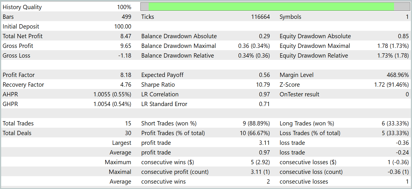 Как следует из представленных данных, за период тестирования модель совершила 15 торговых операций. И 10 из них было закрыто с прибылью, что составило более 66%. Не плохой результат. Особенно с учетом того, что средняя прибыльная сделка в 4 раза превышает аналогичный показатель убыточных операций. Как следствие, мы видим выраженную тенденцию к росту депозита на графике баланса.