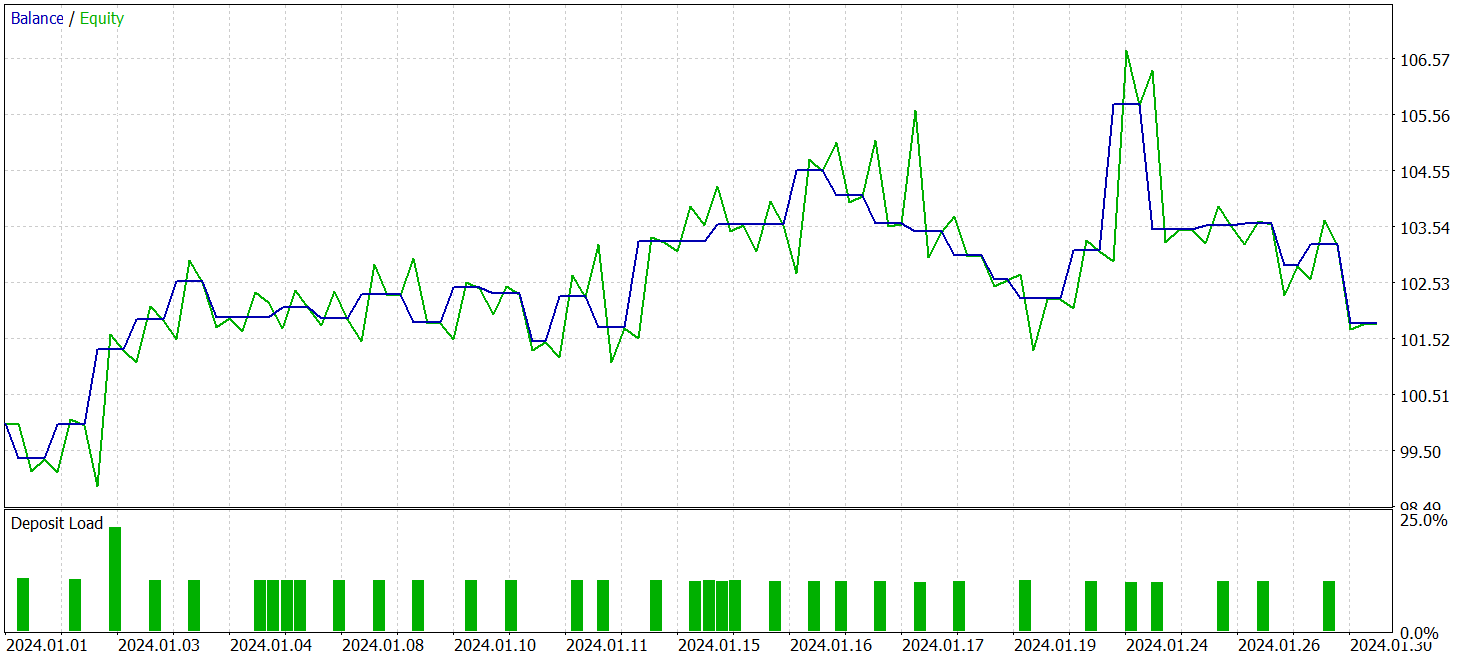 После нескольких циклов обучения нам удалось получить модель, демонстрирующую устойчивую прибыльность как на обучающих, так и на тестовых данных. Финальное тестирование проводилось на исторических данных за январь 2024 года с сохранением всех прочих параметров. Результаты тестирования представлены ниже.