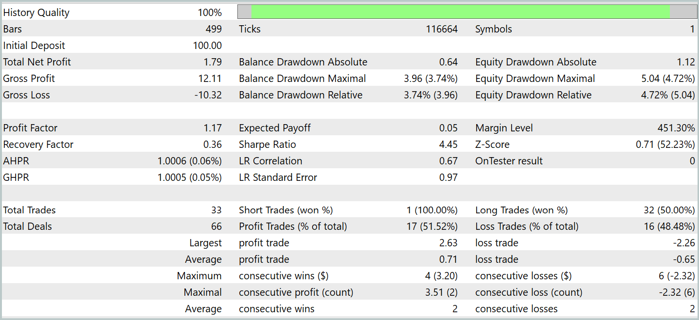 В практической части работы мы реализовали собственную интерпретацию предложенных подходов с использованием языка программирования MQL5, исключив при этом большую языковую модель. Результаты проведенных экспериментов подтверждают эффективность предложенных подходов и их применимость в реальной торговле. Однако для полноценного использования данной модели на реальных финансовых рынках необходимо провести дополнительную настройку модели и обучение на более репрезентативной обучающей выборке с тщательным всесторонним тестированием.