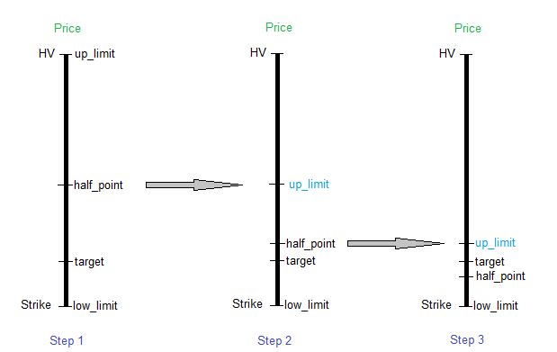 На рис.1 схематично изображен процесс итераций (первые три шага - Step1,..Step3) при поиске точки внутри отрезка (значение target на рис.1). Метод заключается в последовательном определении в какой половине отрезка [up_limit;low_limit] находится искомая точка target. После определения, изменяем границу отрезка (в данном случае, на первых трех шагах верхнюю границу up_limit) на значение середины отрезка: