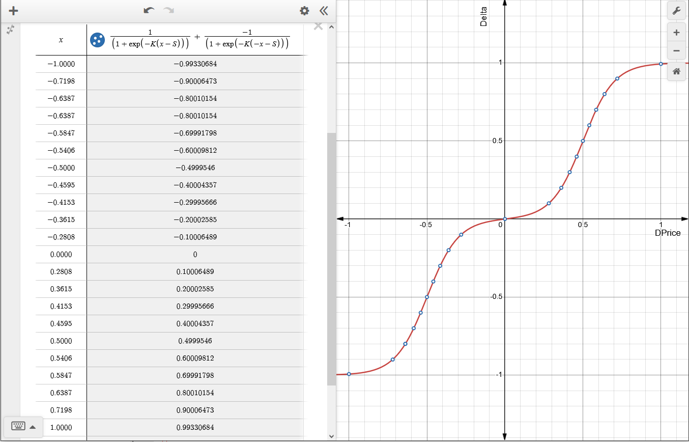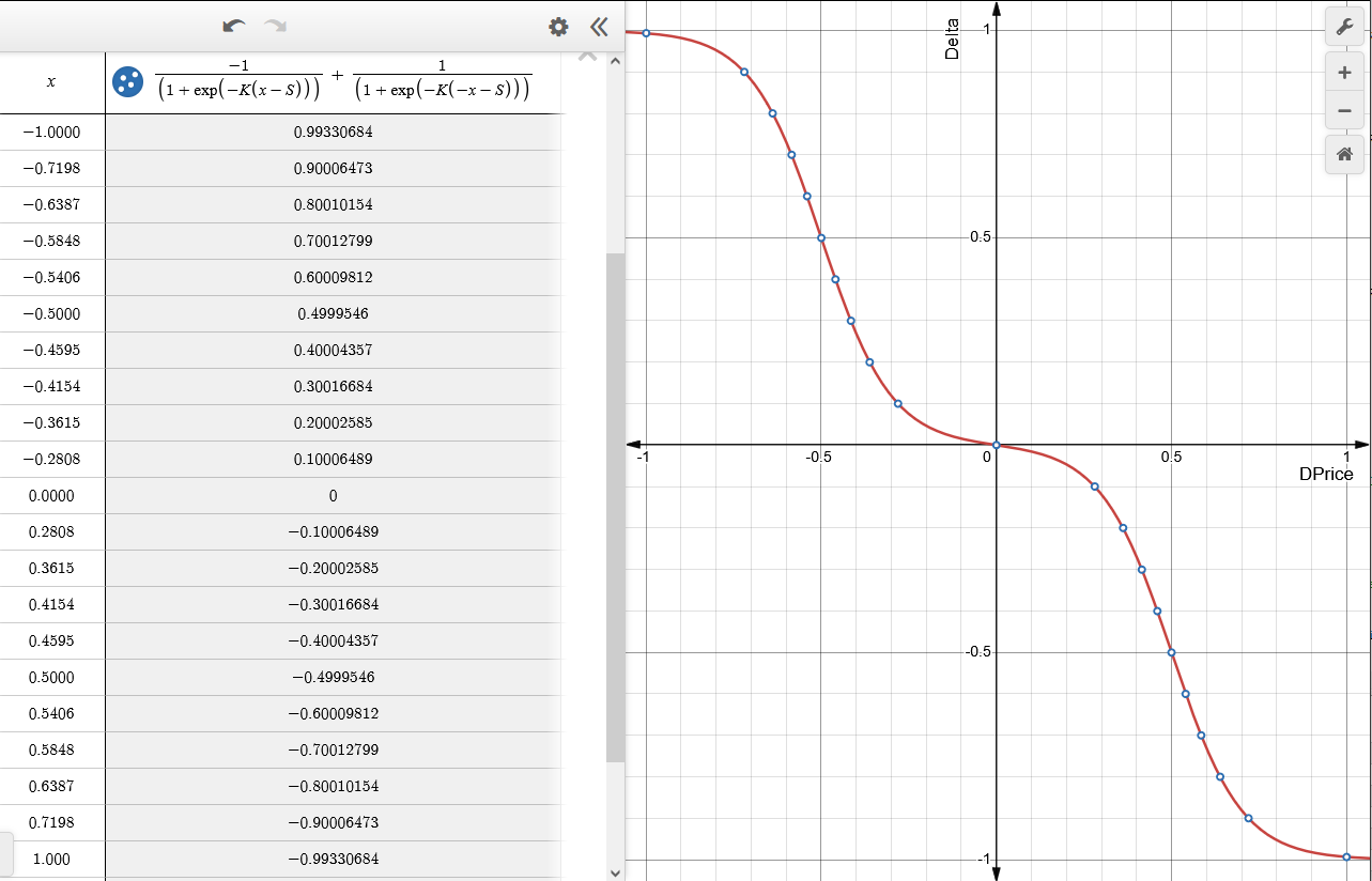 Для вычисления будем использовать метод деления отрезка пополам (метод дихотомии), чтобы не решать уравнение сигмоида в аналитическом виде. Это можно сделать, поскольку сигмоид является непрерывной монотонной функцией от цены и на рабочем участке опционной конструкции (там, где происходит основная ребалансировка) сумма сигмоидов также монотонна.