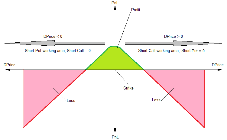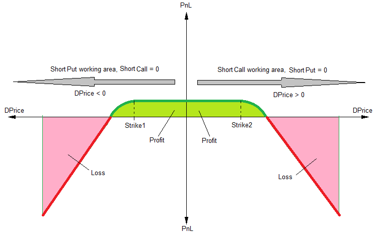 Отличие от Short Straddle в том, что здесь используются два страйка — для отрицательной и для положительной области DPrice. В промежутке между страйками позиция равна нулю, следовательно, размер текущего PnL в этой области не меняется.