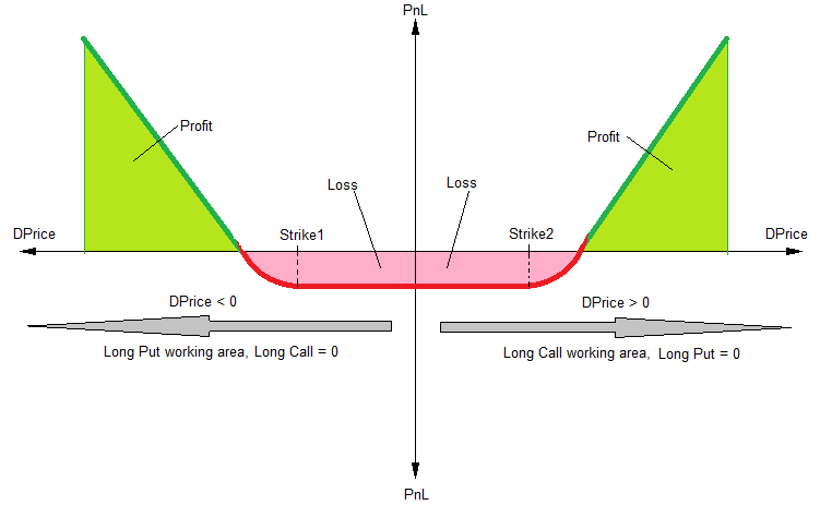 Отличие от Long Straddle состоит в том, что здесь используются два страйка — для отрицательной и для положительной области DPrice. В промежутке между страйками позиция равна нулю, следовательно, размер текущего PnL в этой области не меняется.