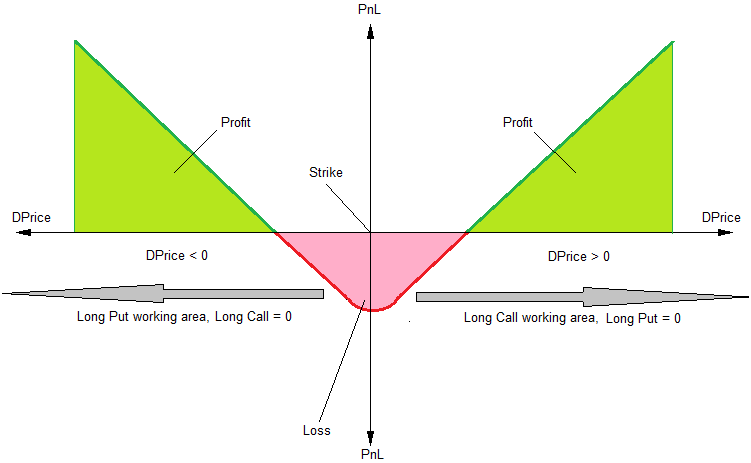 Из графика видно, что максимальный профит получается, если цена базового актива выходит за пределы диапазона волатильности HV (как минимум, не совершает большого числа колебаний между опционными уровнями) — на рисунке закрашено зеленым цветом. Колебания цены между страйками не оказывает влияния на Прибыль/Убыток, так как в этой области дельта обоих обпционов равна нулю.
