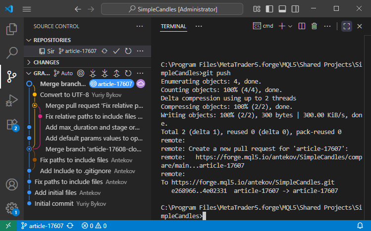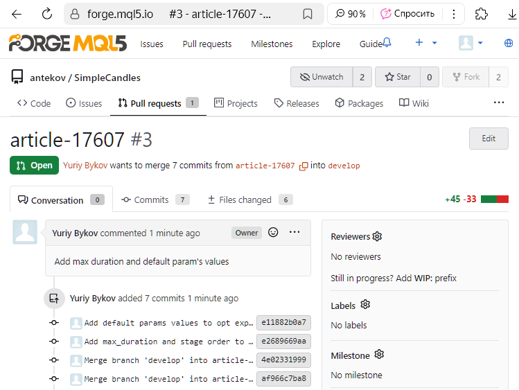 Как видно, последний по времени коммит сделан в ветке article-17607. Создадим через веб-интерфейс хранилища MQL5 Algo Forge запрос на слияние (Pull Request) этой ветки в ветку develop, как это было описано ранее: