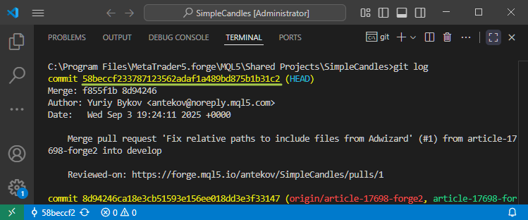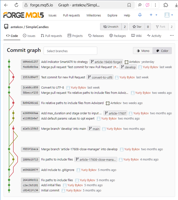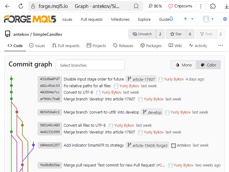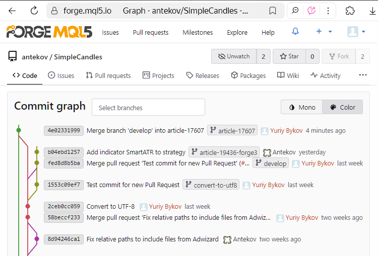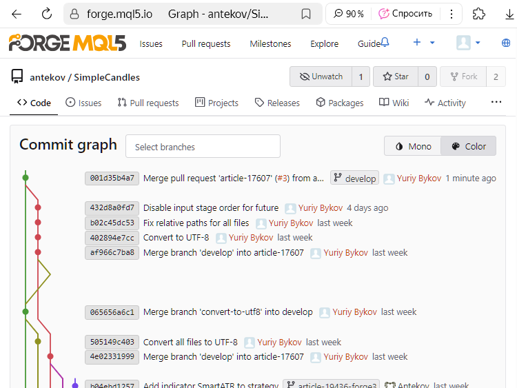 Проверим хранилище MQL5 Algo Forge и увидим, что сделанные нами шаги по слиянию веток благополучно перенеслись в вышестоящий репозиторий: