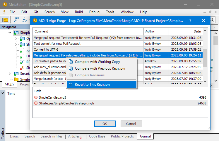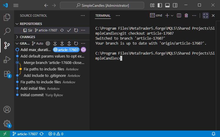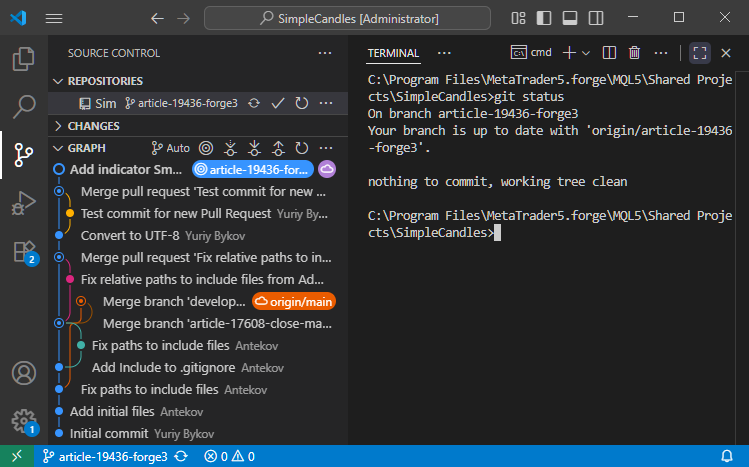 Несмотря на некоторые ограничения интерфейса MetaEditor, комбинация с веб-интерфейсом хранилища MQL5 Algo Forge позволила успешно выполнить всю цепочку действий от клонирования до коммита правок и финального соединения проекта с внешней библиотекой. Таким образом, мы не только решили конкретную задачу, но и рассмотрели универсальный шаблон действий для интеграции любых сторонних компонентов.