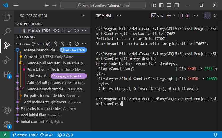 Влить правки из develop в article-17607 можно разными способами. Например, мы можем через веб-интерфейс создать Pull Request и повторить процесс слияния, который описывали в прошлой части. Но так следует поступать в тех случаях, когда новый, непроверенный код мы хотим влить в ветку, содержащую рабочий проверенный код. Сейчас ситуация обратная: из ветки с проверенным, рабочим кодом мы хотим перенести правку в ветку с новым, ещё непроверенным кодом. Поэтому вполне допустимо для выполнения слияния воспользоваться консольными командами Git. Воспользуемся консолью и будем контролировать ход процесса в Visual Studio Code.