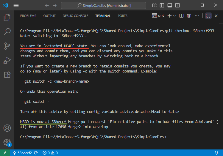 Теперь у нас есть возможность переключиться на этот коммит, приведя наш локальный репозиторий в состояние, как после этого коммита. Для этого мы можем использовать хеш нужного коммита в команде git chekout. Однако тут есть свои нюансы. Если мы попробуем выполнить переключение на этот коммит в MetaEditor, выбрав его из истории, открываемой при нажатии на пункт контекстного меню проекта "Git Log":