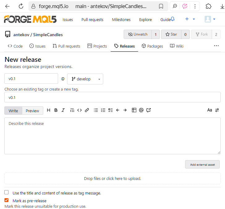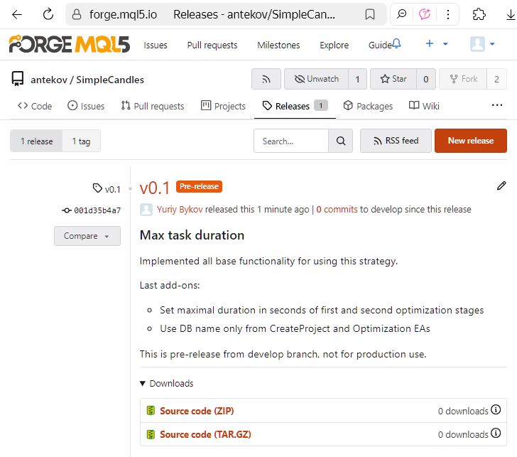 - Распространение бинарных файлов. К релизам можно прикреплять скомпилированные и прочие файлы (.ex5, .dll, .zip) избавляя пользователей от необходимости самостоятельной компиляции, если у них нет в этом особой необходимости.