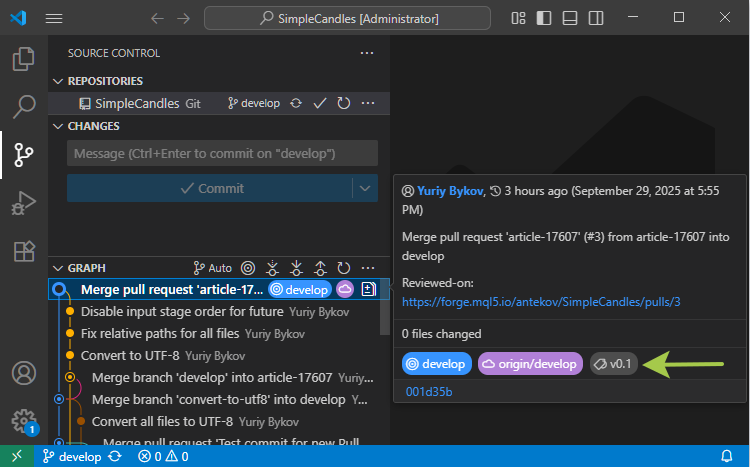 Если мы выполним команду обновления локального репозитория (git pull), то созданный тег появится в нём. Однако в интерфейсе MetaEditor увидеть теги репозитория пока негде, поэтому покажем, как они отображаются в Visual Studio Code. Если навести мышь на нужный коммит в дереве коммитов, то во всплывающей подсказке будет видна цветная метка с именем связанного тега: