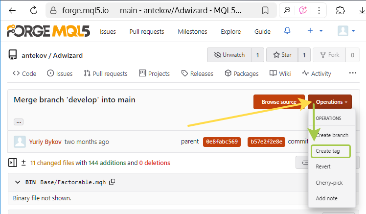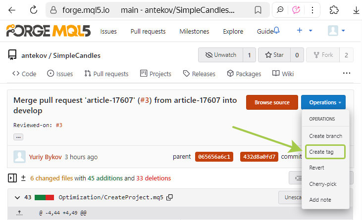В сегодняшней статье мы более детально рассмотрим этап публикации в репозитории сделанных правок, совокупность которых образует некоторое законченное решение — будь то добавление новой функциональности к проекту или исправление обнаруженной ошибки. Это — фиксация или релиз новой версии продукта. Посмотрим, как можно организовать этот процесс, и какие возможности предоставляет нам в этом хранилище MQL5 Algo Forge.