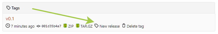 Релиз создаётся на основе какого-либо существующего тега, либо в процессе создания релиза одновременно создаётся и новый тег. Мы тег уже создали, поэтому создадим новый релиз на его основе. Для этого на странице тегов репозитория кликнем на пункт "New release" у нужного тега: